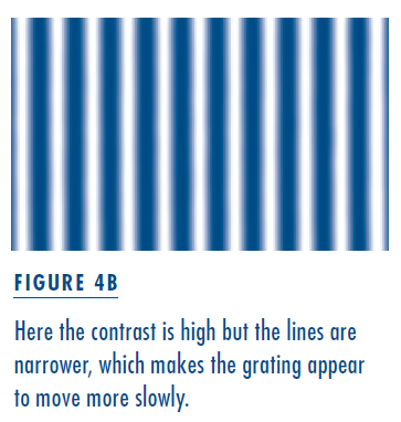 Consider a simple striped pattern like that illustrated in Figure 3. If we were to see that pattern through a window and set it in motion (left to right, say), it would appear to move smoothly, and its apparent speed would be closely related to its actual speed. However, if we either reduce the contrast within the pattern (as in Figure 4A) or make the stripes narrower (as in Figure 4B), the apparent speed would decrease even though the actual physical speed doesn’t change. In fact, if we change the stripes from black and white to a carefully balanced red and green, the motion of the pattern might appear to stop entirely even though it continues to move with the same speed. We do not fully understand why we experience such strange and anomalous percepts. In all these cases, we are quite capable of seeing the individual stripes and telling their