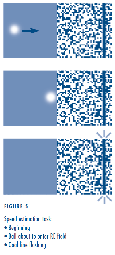 We divided a video monitor screen into halves. On one side was an unpatterned gray field. On the other we drew a pattern of random black and white rectangles, with the same average luminance as the gray field (Figure 5). Near the far edge of this random element (RE) field, we drew a black line extending from top to bottom. We told the observer that the black line was a target and that, when the target was hit, it would immediately flash brightly. As the observer watched, a fuzzy white ball appeared at some randomly determined point in the gray field and began to move at a constant speed toward the RE field. When it reached the edge of the RE field, the ball appeared to move behind it, as though it disappeared behind a wall. The observer was told that the ball continued to move towards the target, but it could either speed up or slow down when it moved behind the wall. Once it reached the target line, the line would flash. The observer’s task was to judge whether the ball moved faster when it was visible against the gray field or when it was not visible behind the RE field. By keeping the width of the RE field constant and varying the speed at which the ball moved when it was visible, we could determine what the observer estimated the actual speed to be.